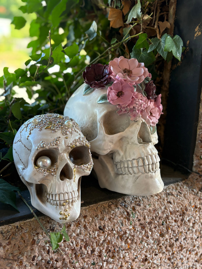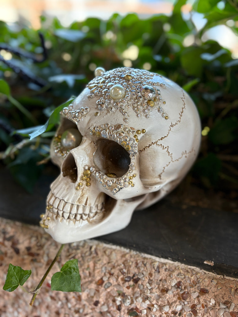 This striking piece is a true fusion of elegance and enchantment. The skull, a timeless symbol of mystery, wisdom, and transformation, is adorned with shimmering silver tones and luminous pearl appliqués, creating a dazzling contrast between edgy darkness and ethereal light.
